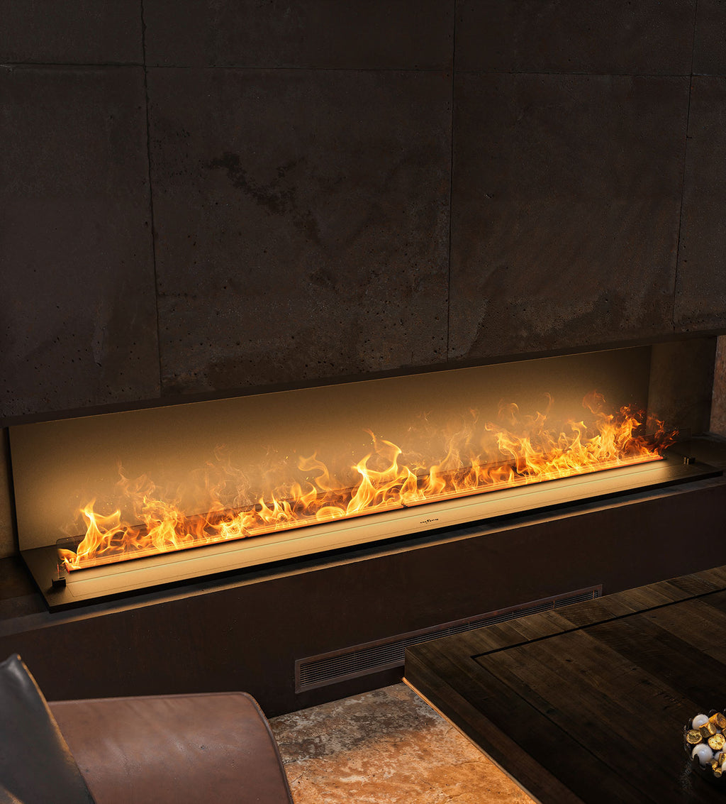Il caminetto a vapore Infire Inside Invapo C2200 Multicolor è uno spettacolare elemento di design progettato per grandi spazi. Questo caminetto da incasso utilizza due cassette Optimyst da 1000 mm per creare una linea di fuoco di 2 metri, offrendo un effetto fiamma naturale e diffusa. La cornice a forma di C conferisce un tocco di leggerezza e modernità, permettendo di ammirare l'effetto realistico del fuoco da diverse angolazioni.