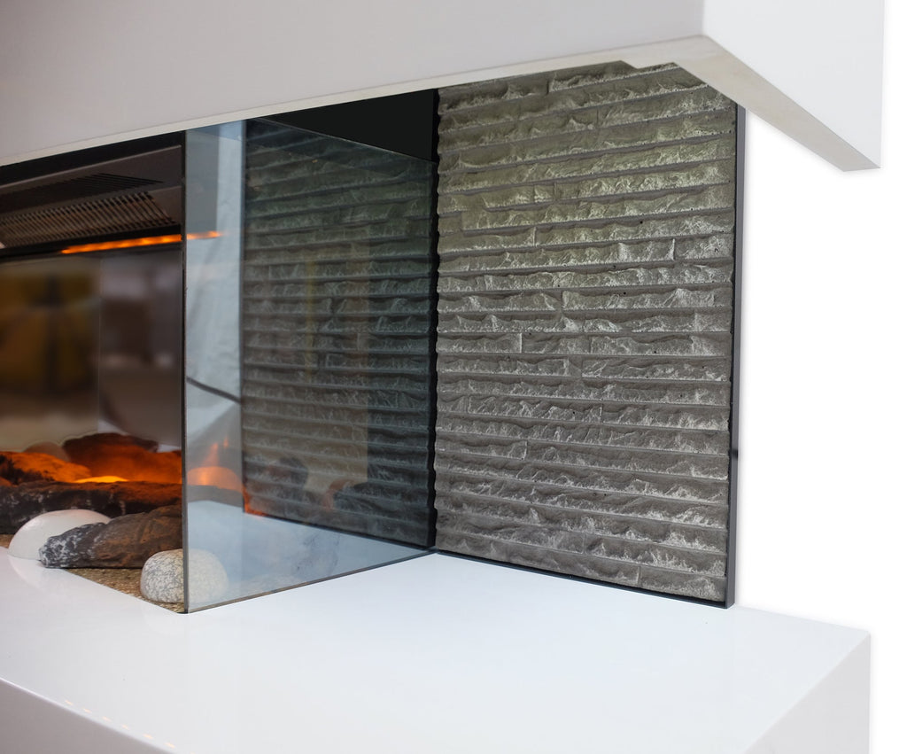 Lounge dekorativer elektrischer Wandkamin in Weiß und Glas mit Korpus aus weiß lackiertem MDF-Holz und zwei Seitenwänden aus Schiefer, ausgestattet mit einem elektrischen Kohlenbecken, das in einem Glaskasten eingeschlossen ist: Unter dem Kohlenbecken befindet sich eine LED-Platte, die das Brennen noch intensiver macht Flammen- und Gluteffekt, der mit LED-Technologie nachgebildet wird, ist realistisch. Die Leistung 1000-2000 Watt wählbar über das Bedienfeld geeignet für Räume bis 30 qm. Ohne echte Verbrennung gibt es weder Rauch noch unangenehme Gerüche ab, benötigt keinen Abzug, ist sehr dekorativ und hat ein modernes Design, das sich gut für alle Umgebungen eignet.