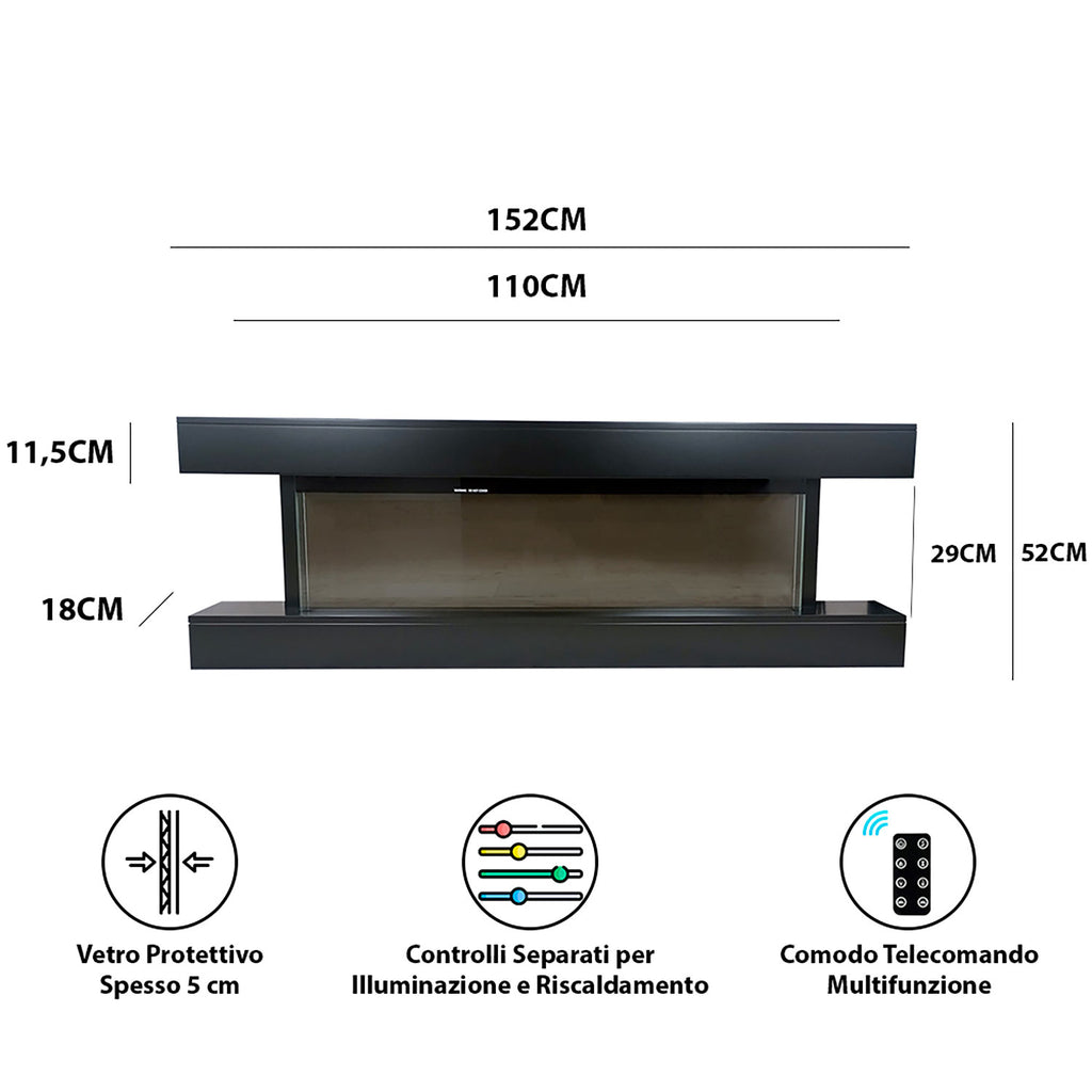 Camino Elettrico da Parete o Incasso Alaro Ultra+ 152x18x52 cm Effetto Fiamma Telecomando in MDF Nero