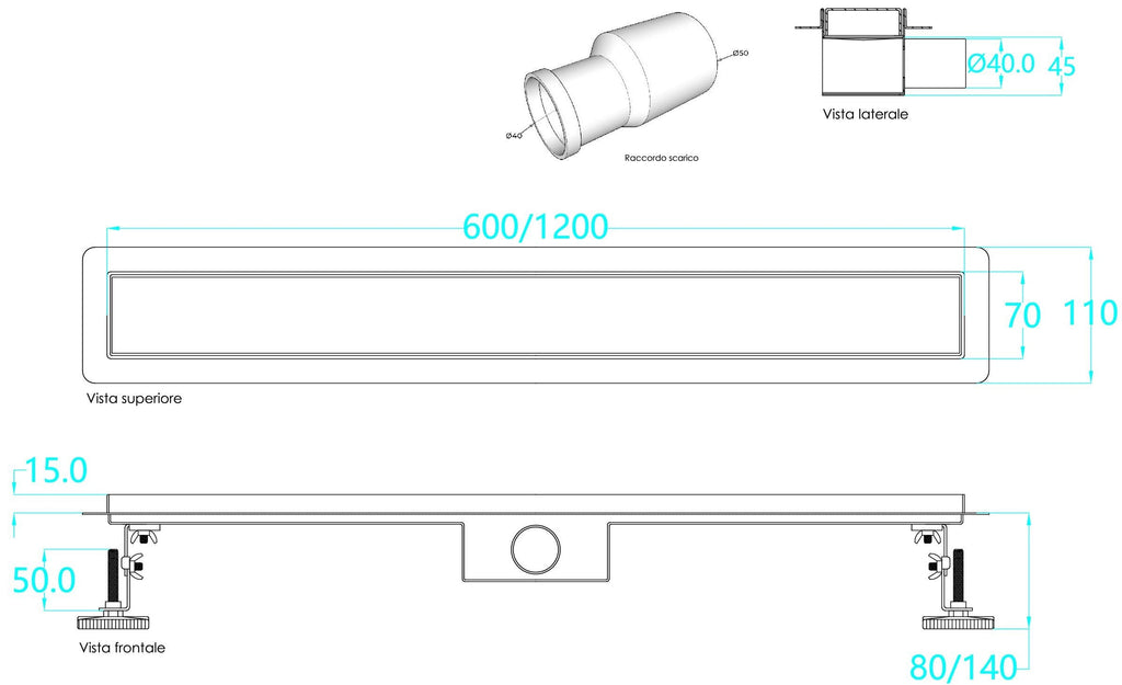 Die Breite des Kanals beträgt 7 cm, während die Längen von 60/70/80/90/100/110/120 cm variieren.