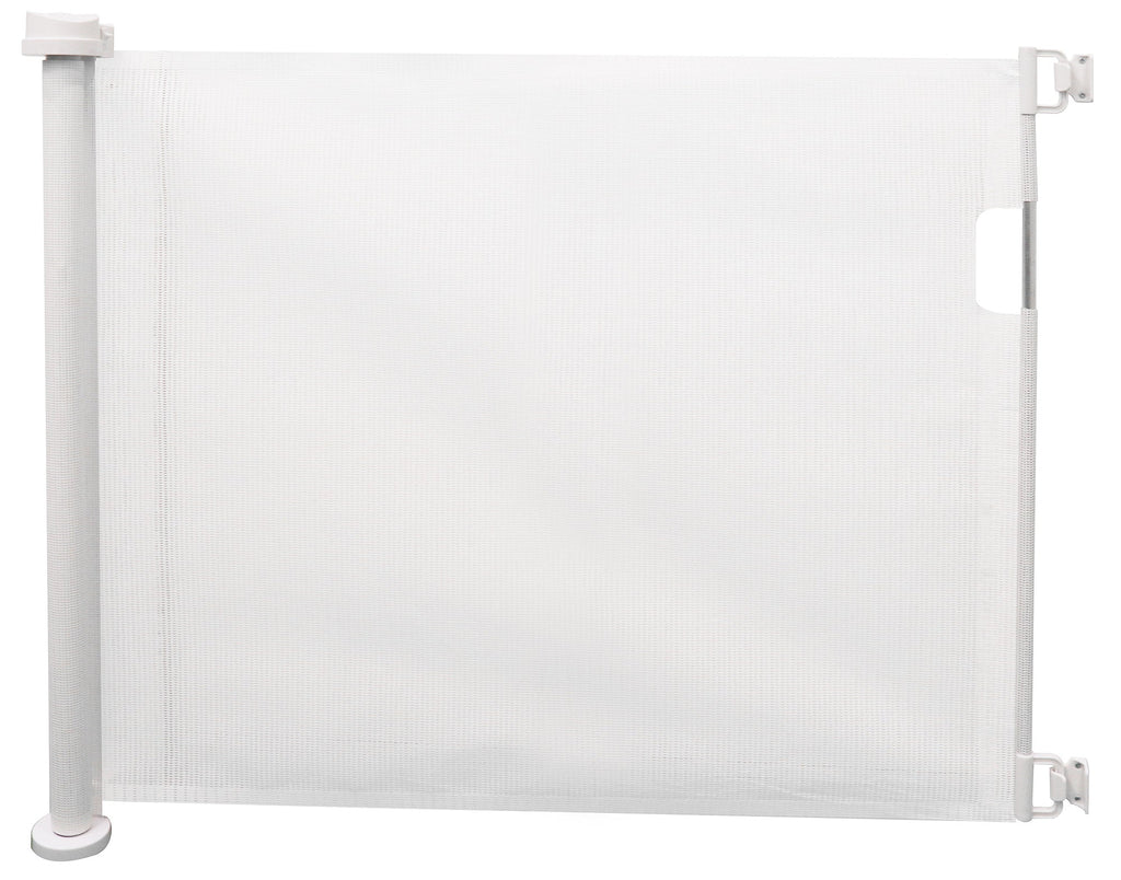 Die Aufrollfähigkeit macht diese Barriere zu einem Platzsparer und Wandhalterungen halten diese leichte und dennoch starke Barriere an Ort und Stelle, um zu verhindern, dass Kinder unsichere Bereiche betreten.