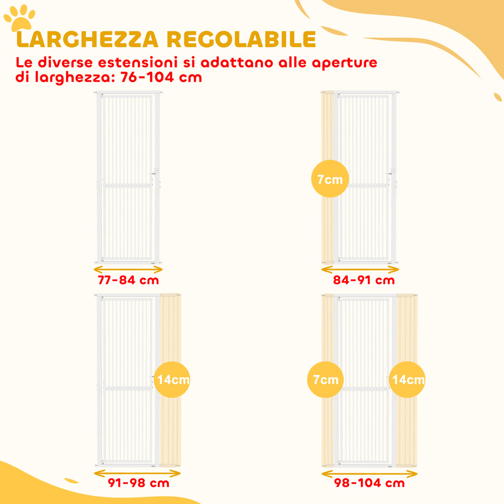 • ADATTABILITÀ PERFETTA: Fornito con estensioni di 7 cm e 14 cm, questo cancelletto per cani regolabile si estende facilmente coprendo aperture da 76 cm a 104 cm, offrendo una barriera affidabile per ogni corridoio, scala o ingresso nella tua abitazione