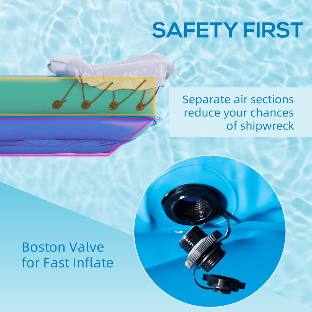 - SICHER: Dieses 2-Personen-Kanu besteht aus 11 aufblasbaren Abschnitten und ist so konzipiert, dass Sie jederzeit über Wasser bleiben. Für den Fall, dass einer der Abschnitte punktiert wird, bleiben die anderen 10 geschwollen und helfen Ihnen beim Weitersegeln
