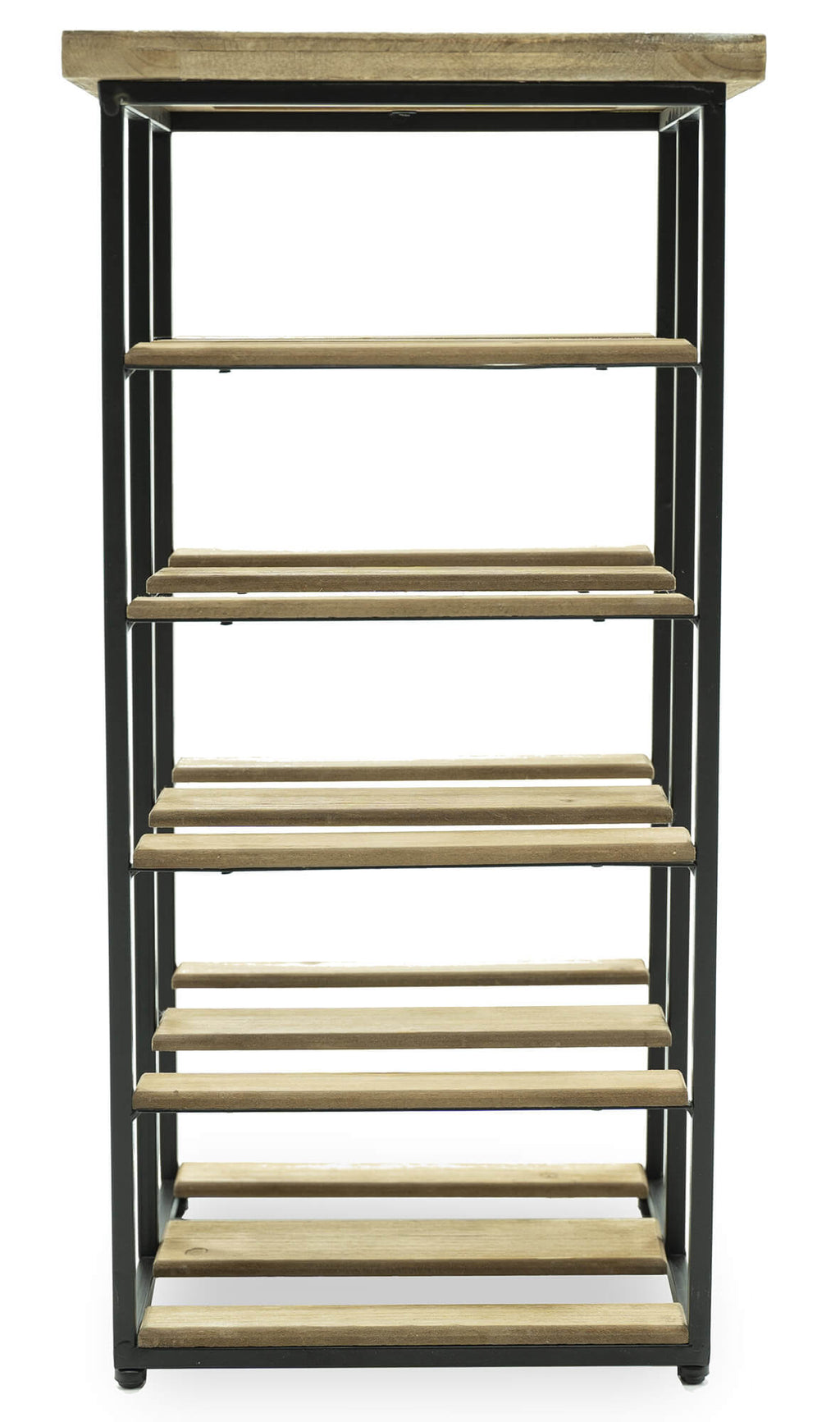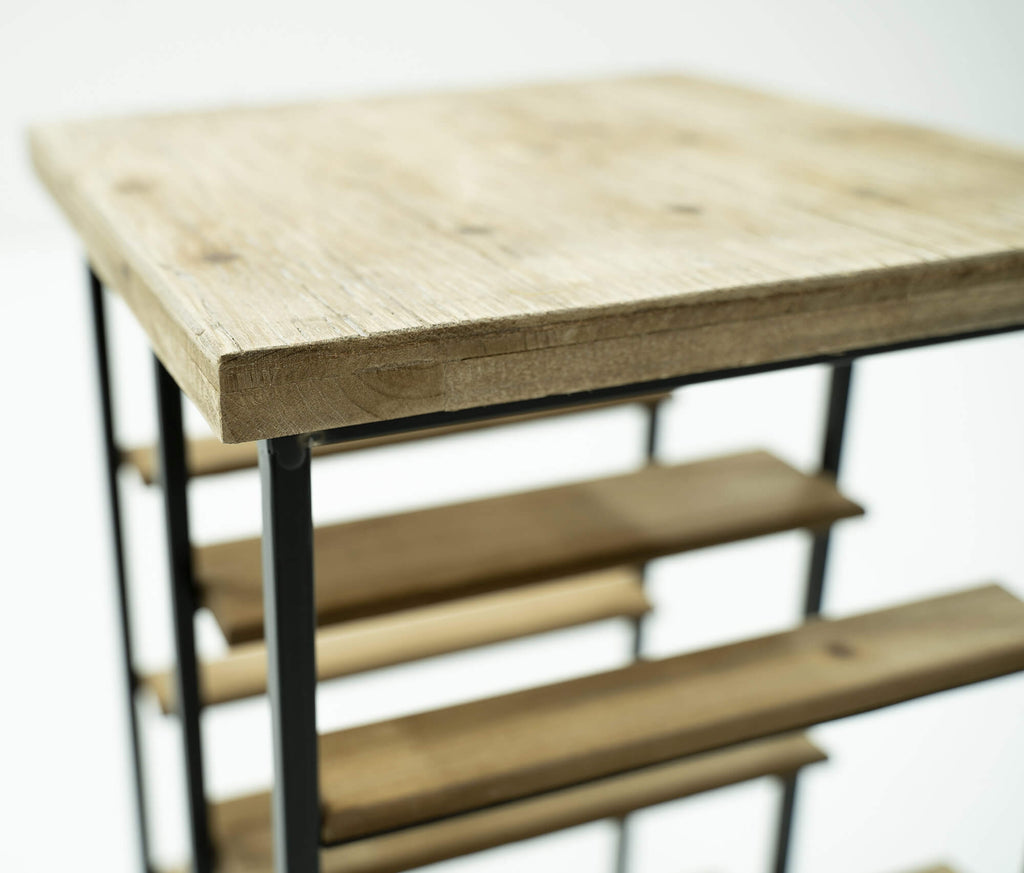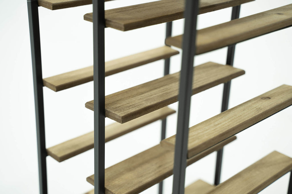 Mit seinem industriellen Stil eignet sich das Regal Joy perfekt für die stilvolle Einrichtung von Innen- und Außenbereichen. Hergestellt mit einer soliden Eisenstruktur und verschiedenen Holzregalen. Dank der hohen Qualität der Materialien ist es beständig gegen Witterungseinflüsse und schlechtes Wetter.