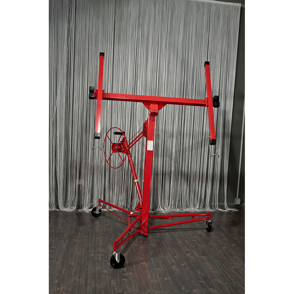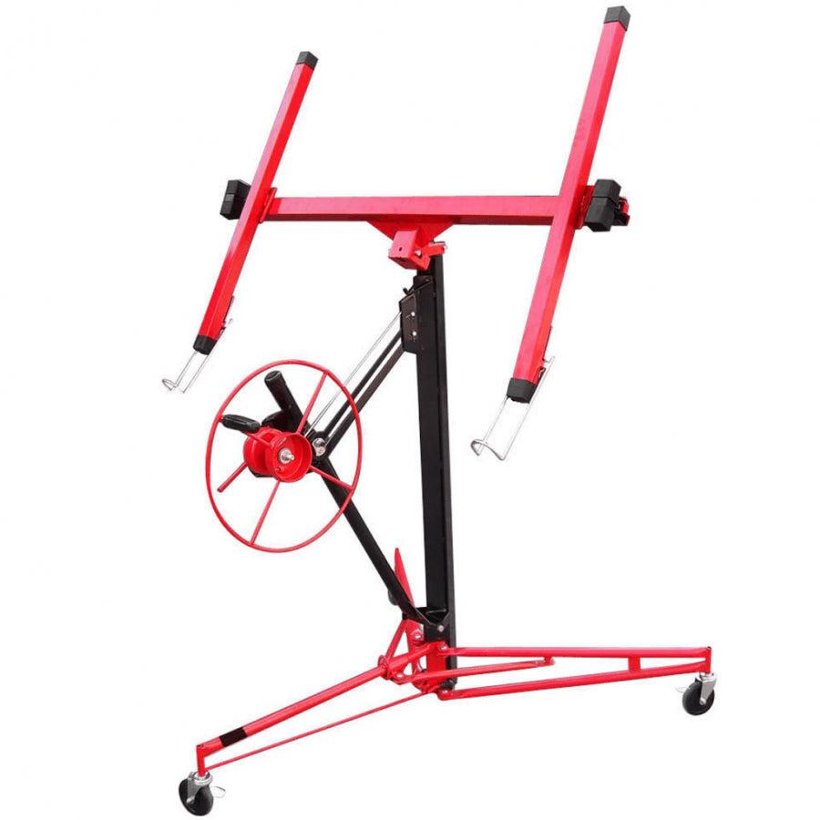 Der Plattenheber oder Plattenheber ist ein mechanisches Werkzeug, das schnell und einfach zu bedienen ist. Um Trockenbauplatten zu installieren, müssen Sie die obere Plattform in eine aufrechte Position bringen. An dieser Stelle wird die Gipskartonplatte auf die entsprechenden Stützen gelegt und die Plattform auf die gewünschte Neigung eingestellt. Sobald dies erledigt ist, brauchen Sie nur noch das mit der Winde verbundene mechanische Rad zu betätigen, mit dem Sie die Gipskartonplatte anheben und einfach auf Montagehöhe halten können. Die Verwendung des Gipskartonhebers zur Montage von Trockenbauplatten an der Decke oder vertikal macht das Anheben und Montieren von Gipskartonplatten extrem einfach und schnell. Es kann Gipskartonplatten mit einem Gewicht von bis zu 68 kg tragen. Um das Positionieren der Gipskartonplatten zu erleichtern, kann die Stütze des Plattenhebers bis zu 88 cm abgesenkt und seine Höhe bis zu 3,35 m horizontal und 3,78 m vertikal erreicht werden.