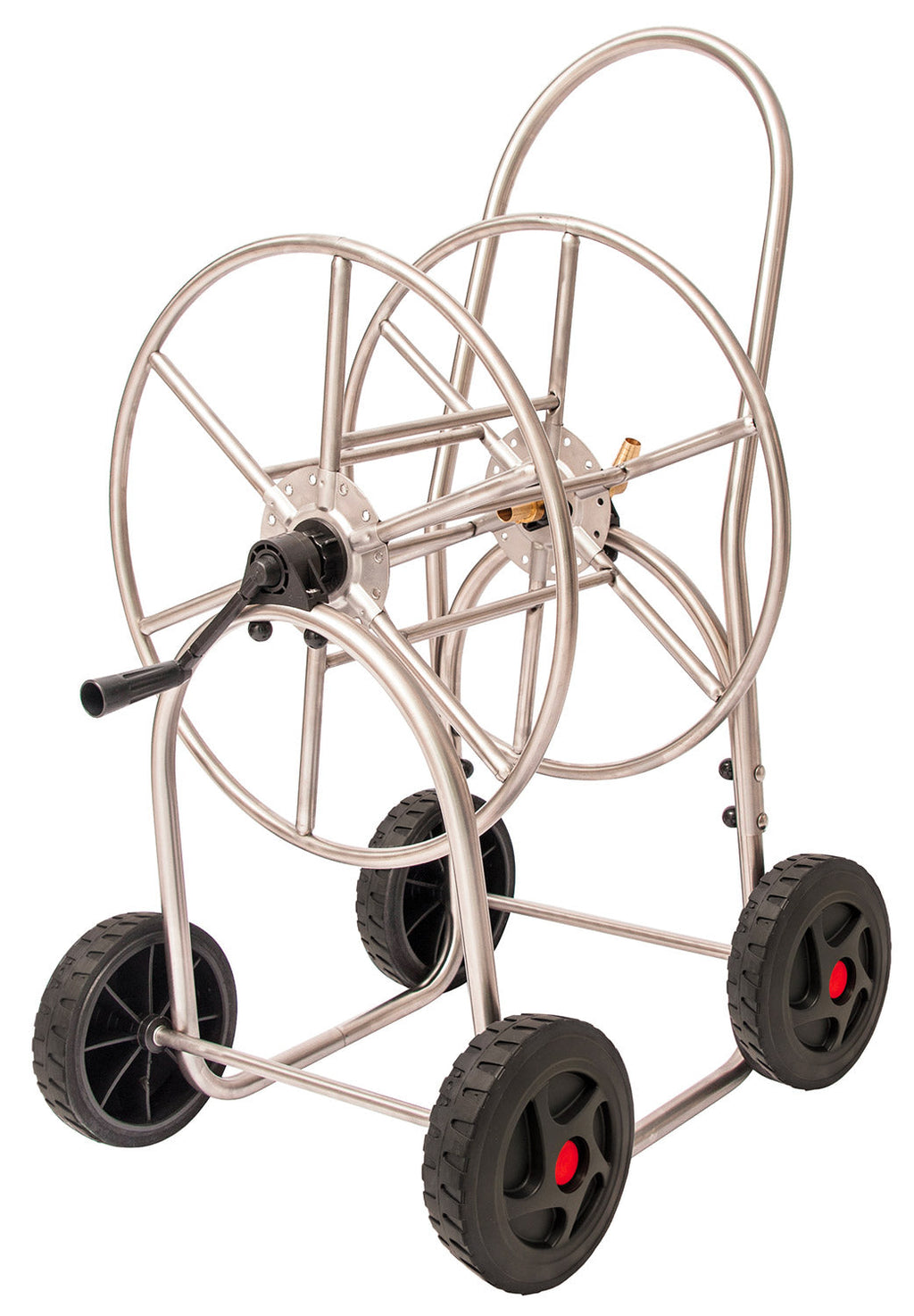 Professioneller Schlauchwagen aus Edelstahl AISI 304, um maximale Widerstandsfähigkeit auch bei widrigen Umgebungsbedingungen (z. B. in feuchten Umgebungen, Meeresgebieten usw.) zu gewährleisten. Er kann bis zu 80 Meter 3/4-Zoll-Schlauch aufnehmen. Die vier Räder mit großem Durchmesser, die mit Vollgummi überzogen sind, ermöglichen ein müheloses Bewegen des Wagens.