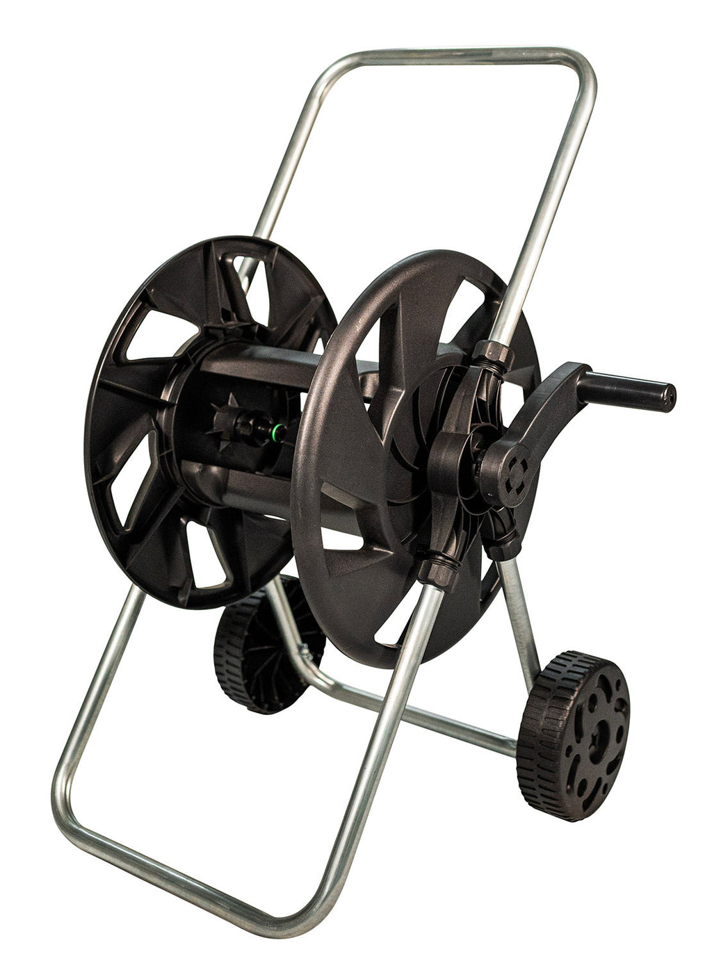 Schlauchwagen mit Gestell aus verzinktem Stahl und Laufrolle aus Polypropylen. Es kann bis zu 60 Meter 1/2" Schlauch aufnehmen.