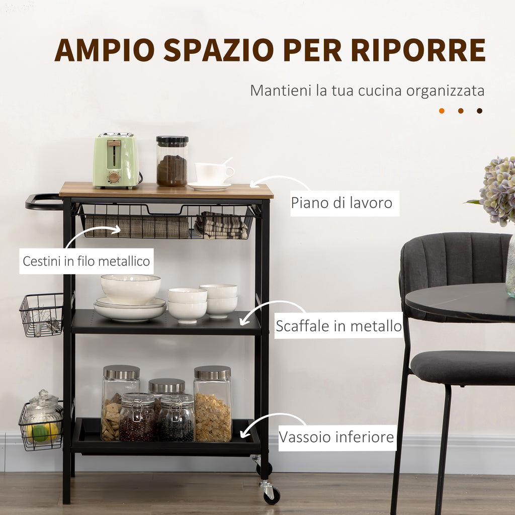 3-stöckiger Küchenwagen 75 x 43,5 x 91 cm mit 2 Rollen und abnehmbarem Korb in Holz und Schwarz