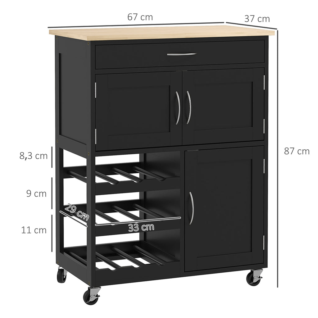 Il nostro portabottiglie può contenere fino a 9 bottiglie. Carrello da cucina formato da 3 antine e un cassetto. Carrello portavivande con 4 ruote (2 con freno). Piano d'appoggio in legno di caucciù. Montaggio richiesto.