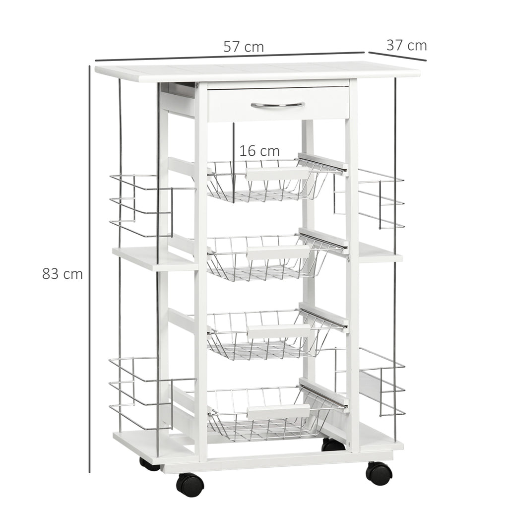Hai bisogno di più spazio in cucina? Questo carrello portavivande è il supporto che stai cercando. Grazie al comodo cassetto, ai 4 cesti estraibili e ai 4 ripiani laterali, il nostro carrello ti aiuterà a tenere il tutto sempre in ordine. Resistente e funzionale, questo carello da cucina è costruito in legno di pino e metallo per sostenere fino a 50 kg ed è dotato di un piano d'appoggio rivestito con piastrelle in ceramica bianca.