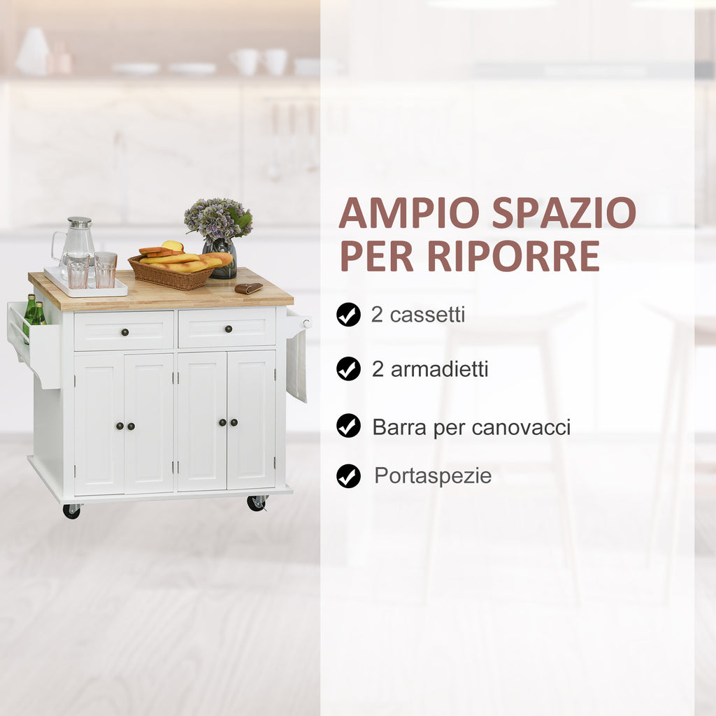 Sie sind sich nicht sicher, wie Sie den Platz in der Küche optimieren können? hat die Lösung für Sie: Dieser elegante und praktische Küchenwagen ist perfekt für jede Umgebung und für verschiedene Arten von Möbeln. Mit 2 Schubladen, 2 Schränken, einem Geschirrtuchhalter und einem Gewürzregal bietet Ihnen diese kleine Kücheninsel viel Stauraum. Benötigen Sie den Servierwagen auch außerhalb der Küche? Dank der 4 Räder können Sie es mühelos dorthin bewegen, wo Sie es brauchen. Wählen Sie es als Ihren täglichen Assistenten!