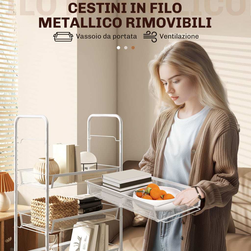 - CESTI REMOVIBILI: I cestini in filo metallico del carrello salvaspazio consentono un'adeguata circolazione dell'aria e sono perfetti per conservare verdura, frutta e biancheria piegata. I cesti sono dotati di 4 ganci rimovibili per appendere asciugamani, chiavi e altri piccoli accessori