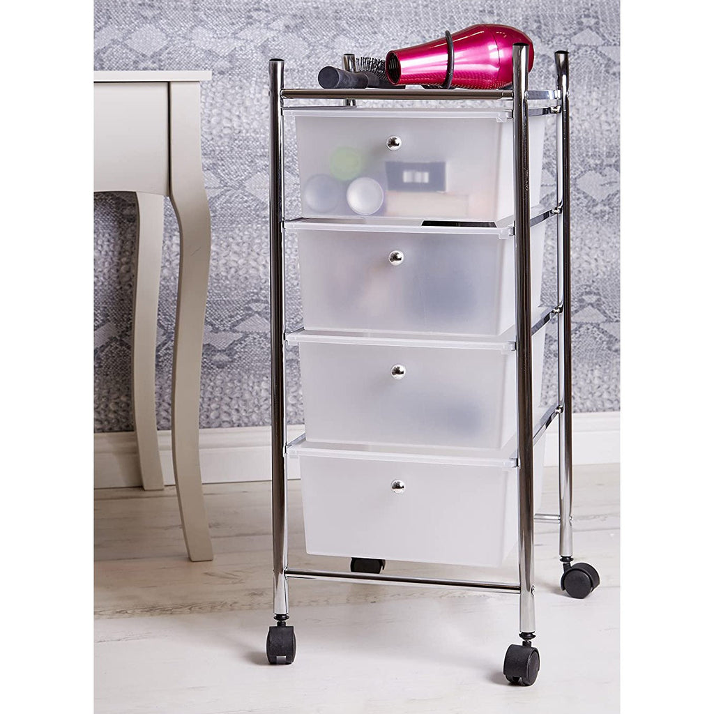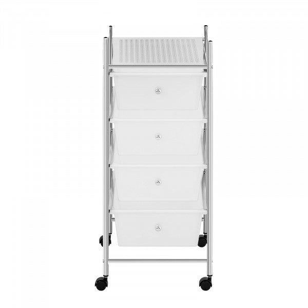 Der Trolley ist dank seiner 4 Kunststoffschubladen und einem Stahlgestell vielseitig einsetzbar, die Kommode bietet genügend Platz um Ihre Utensilien zu verstauen.