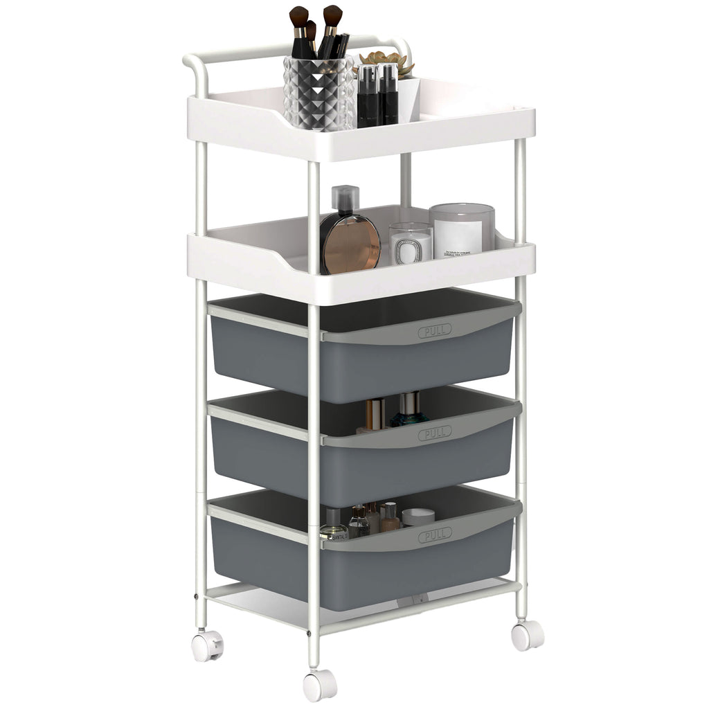Carrello Portaoggetti Multiuso 40x34x85 cm con 2 Ripiani e 3 Vassoi Scorrevoli in Acciaio e PP Bianco e Grigio