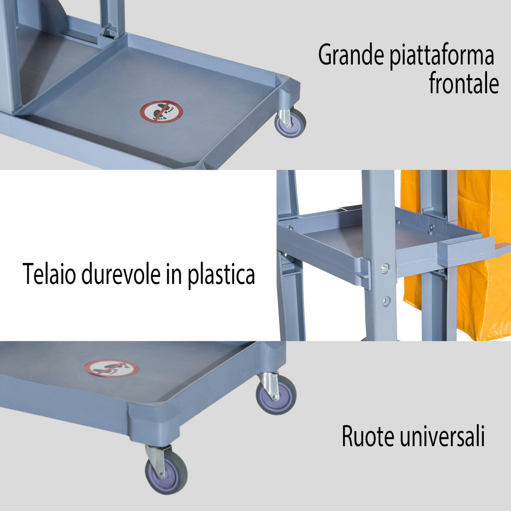 Sammeln Sie mit diesem Reinigungswagen Müll oder schmutzige Kleidung aus Ihrem Zuhause. Mit 3 stabilen Regalen, Müllsackhaltern und Besenhaken wurde sein Design entwickelt, um die Arbeit zu erleichtern. Darüber hinaus macht seine Kunststoffkonstruktion den Trolley zu einem starken, soliden und zuverlässigen Werkzeug für den täglichen Gebrauch. Die vordere Hauptablage ist perfekt für einen zusätzlichen Wischeimer. Das gesamte Design erleichtert jede Art von Reinigungsaufgabe.