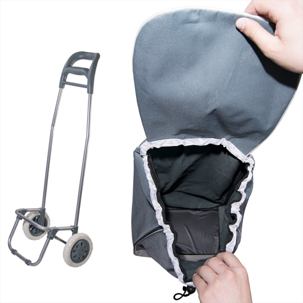 Dieser sehr praktische Trolley besteht aus einer abnehmbaren Tasche aus grauem PVC-beschichtetem Polyester und einem Aluminiumrahmen mit abnehmbaren Rädern.Die Rahmenstruktur ist sehr leicht, aber gleichzeitig robust und widerstandsfähig, außerdem lässt er sich leicht schließen, um nicht sperrig zu sein dann legen Sie es irgendwo hin.