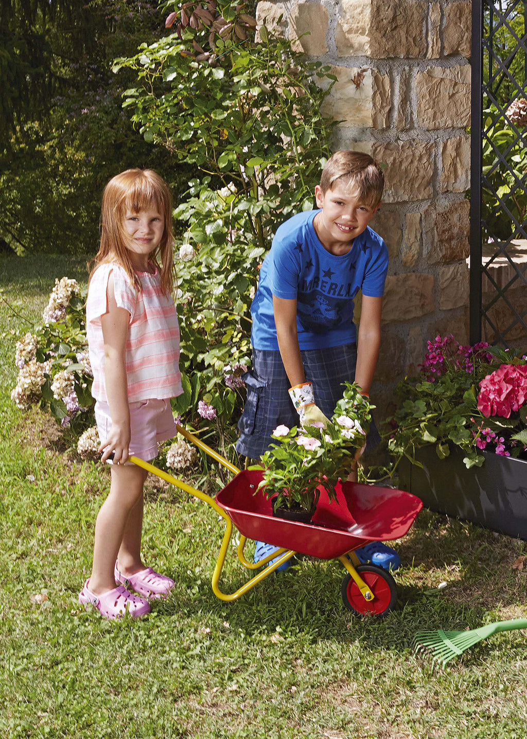 Schubkarre für Kinder aus rot und gelb lackiertem Stahl