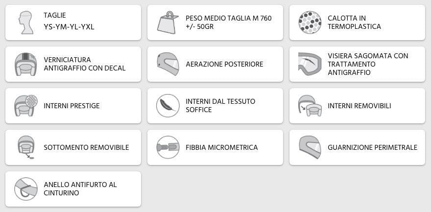 Der 205 ist ein leichter Demijet für Kinder mit einer umhüllenden Passform und einem brillenförmigen Visier, der aus einer speziell für Kinder entwickelten Schale mit 4 Größen für die verschiedenen Altersgruppen hergestellt wird. Die farbenfrohen Grafiken des 205G werden auch in den Details der Innenausstattung und des Zubehörs behandelt, die spezifische Farbkombinationen mit jeder Farbe der Grafik haben.