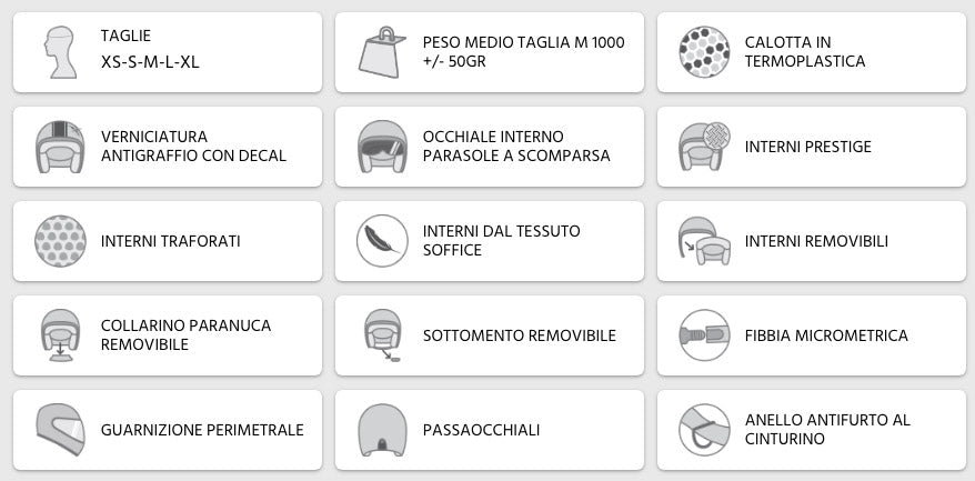 Aus einer extrem kompakten Schale gefertigt, gehören zu den Hauptmerkmalen die extra getönte interne einziehbare Brille, die vollständig herausnehmbaren und waschbaren Futter und Wangenpolster, der abnehmbare Nackenkragen mit Reißverschluss und der hintere Brillenhalter zur Unterbringung der Helmbrille. Die Kombinationen von Materialien, Oberflächen und Farben machen den Helm 105G zu einem modischen Accessoire.