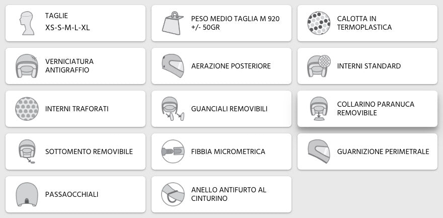 Hergestellt aus der kompaktesten und leichtesten Schale der Kategorie, zu deren Hauptmerkmalen der abnehmbare Kragen mit Reißverschluss und der hintere Brillenhalter für die Helmbrille gehören. Der 104A wird ohne Visier oder Schirm hergestellt , die kleinen Abmessungen ermöglichen ein einfaches Verstauen in allen Untersitzfächern des Rollers.