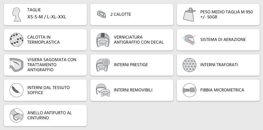 Die 107 ist das Referenzmodell der Marke CGM, sie ist ziemlich undurchsichtig und umhüllend, aber gleichzeitig extrem kompakt und leicht. Ergonomischer und bequemer Helm, der in zwei Schalengrößen aus thermoplastischem Material hergestellt wird, um optimale Tragbarkeit und Komfort für alle Größen zu bieten. Das Belüftungssystem Air Stream System mit zentralem Lufteinlass und hinterem Abzug wird durch perforierte Innenräume vervollständigt, die mit Metallgittern für den Luftdurchgang angereichert sind.