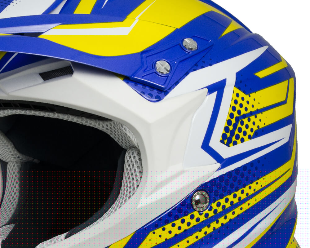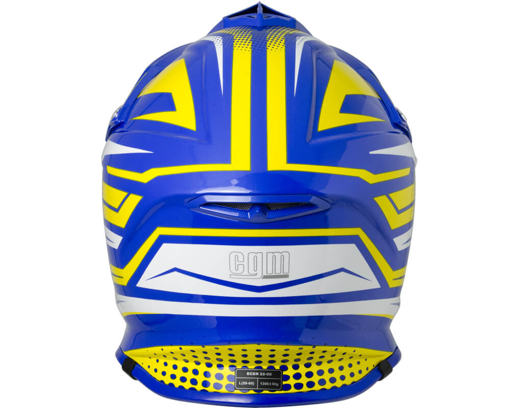 CGM-Crosshelm mit einer extrem aggressiven Designschale, die so konzipiert wurde, dass sie sich an den Stabilisatorkragen anpasst. Dieser Helm verfügt über Belüftungsöffnungen mit sichtbarem Netz und Staubschutz vorne und an den Seiten des Kinnschutzes sowie unter dem Schirm. Die Innen- und Wangenpolster sind komplett herausnehmbar und waschbar, der Riemen hat einen Doppelringverschluss. Die 601S-Version wird mit farbenfrohen Grafiken produziert, die die Lufteinlässe und farbigen Dichtungen verwenden, um Farbkombinationen zu erstellen.