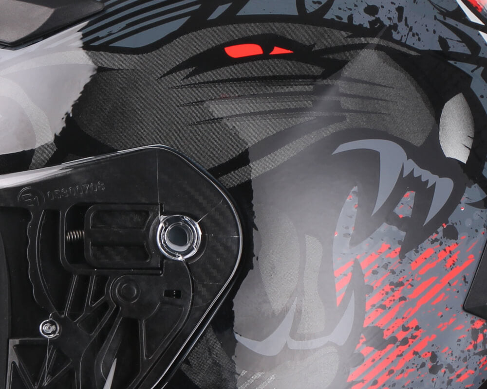 Das neigbare Visierbefestigungssystem drückt das Visier im geschlossenen Zustand auf die Helmdichtung und sorgt so für eine optimale Haftung.