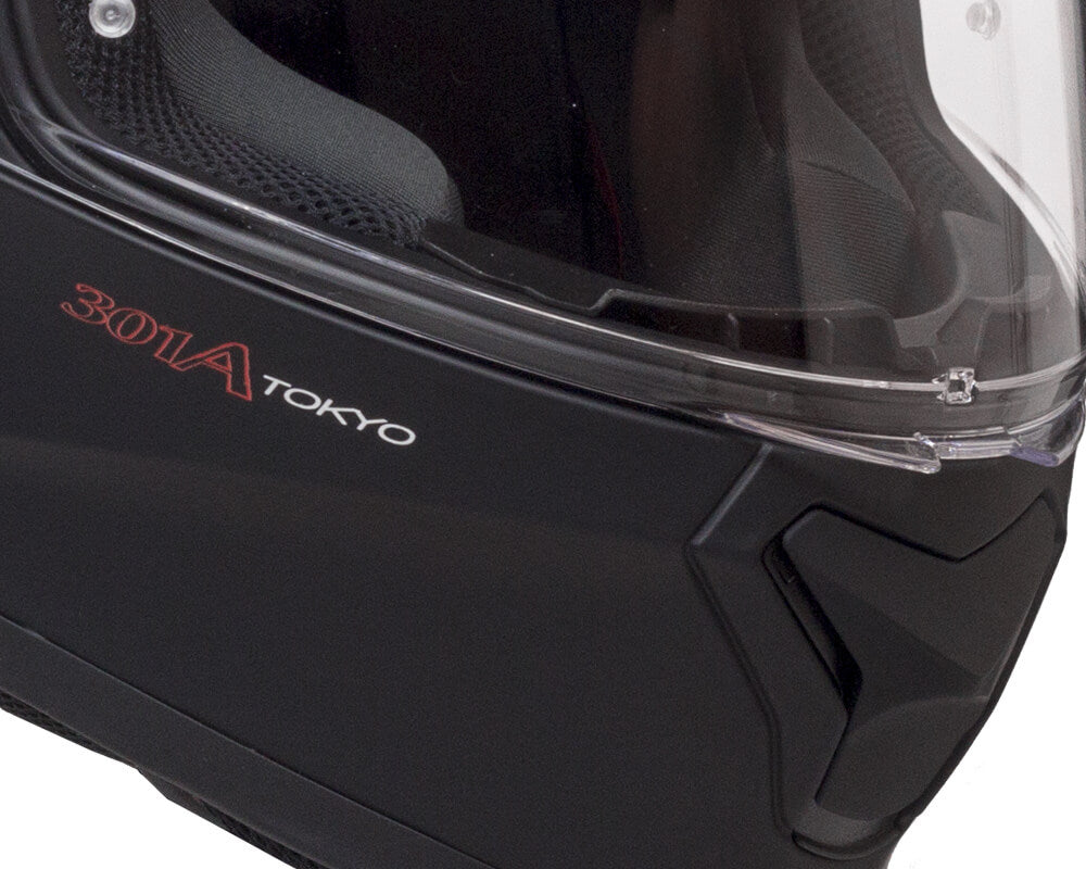 Integral mit extrem sportlichen Linien, ist der 301 mit einem externen Visier mit einem vergrößerten Sichtfeld, mit einer Verriegelungsvorrichtung und einer Prädisposition für ein PINLOCK-Objektiv ausgestattet. Es ist auch mit einem Belüftungssystem ausgestattet, das durch das Vorhandensein eines Lufteinlasses am Kinnschutz, eines oberen Lufteinlasses und eines Heckspoilers mit doppeltem Luftabsauger garantiert wird.