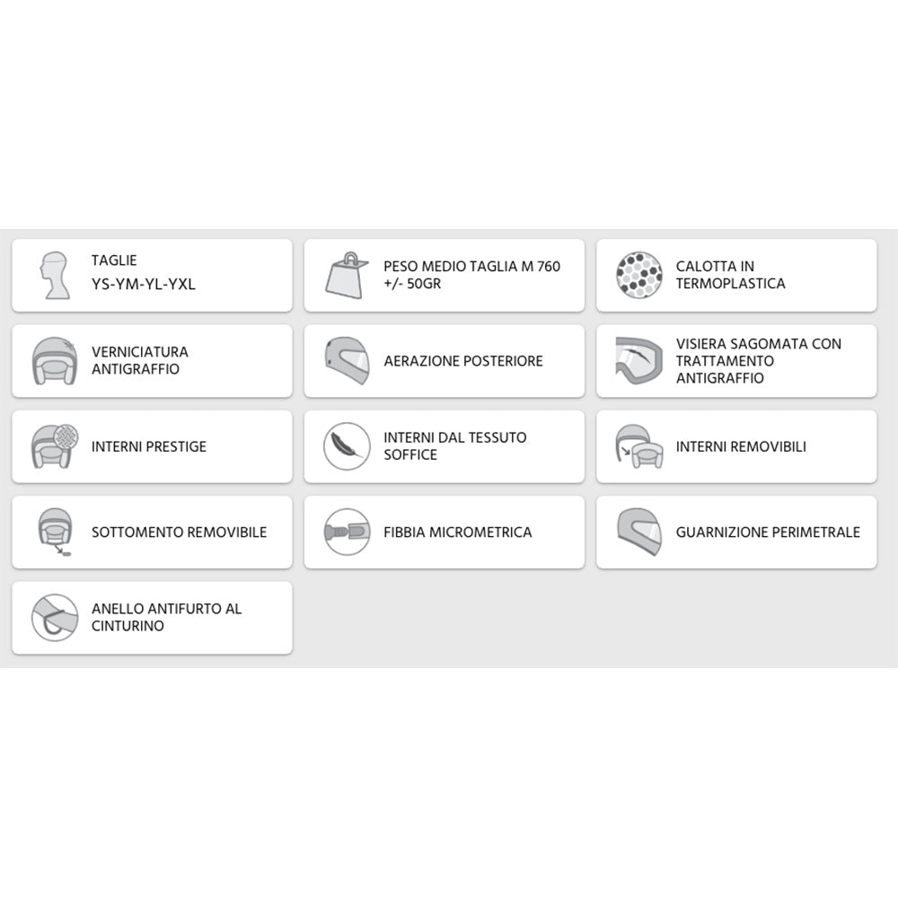 Der Helm Havana 205A wird mit einer speziell für Kinder entwickelten Schale hergestellt, die 4 Größen hat, um die verschiedenen Altersgruppen abzudecken. Der 205 ist ein leichter Halbjet für Kinder mit einer umhüllenden Passform und einem geformten Visier wie eine Brille. In der einfarbigen Version wird es in fünf verschiedenen Farben hergestellt und zeichnet sich durch herausnehmbare und waschbare Innen- und Wangenpolster in hellen Farben aus, die zum weißen Kunstleder der äußeren Wangenpolster, des Unterkinns und der Umfangsdichtung der Schale passen die weiße Schraube des Visierbefestigungssystems.