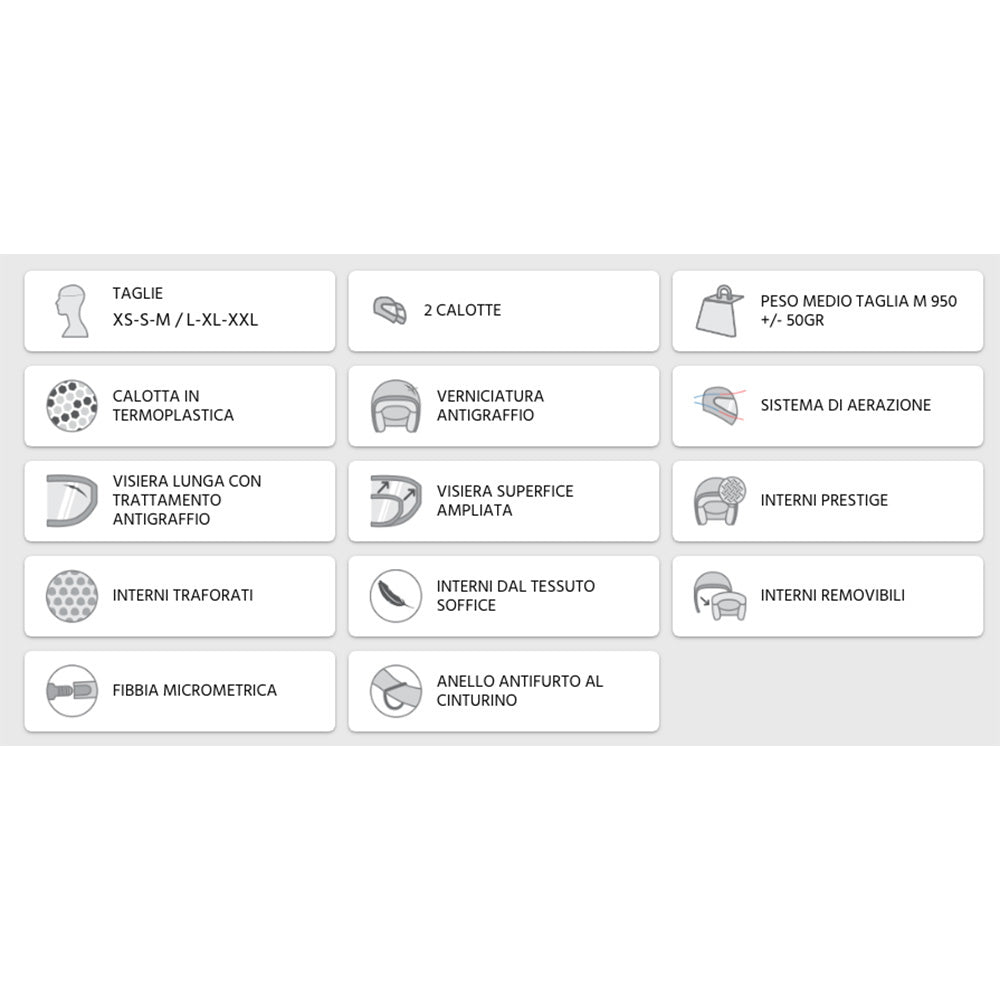 Der 107 Jethelm für Scooter, Motorräder und Quads ist das Referenzmodell der Marke CGM , er ist ziemlich undurchsichtig und umhüllend, aber gleichzeitig extrem kompakt und leicht. Ergonomischer und bequemer Helm, der in zwei Schalengrößen aus thermoplastischem Material hergestellt wird, um optimale Tragbarkeit und Komfort für alle Größen zu bieten. Das Belüftungssystem Air Stream System mit zentralem Lufteinlass und hinterem Abzug wird durch perforierte Innenräume vervollständigt, die mit Metallgittern für den Luftdurchgang angereichert sind. Das lange Visier hat eine schräge Oberkante, die die vordere Dichtung abdeckt und für einen besseren Sitz sorgt.