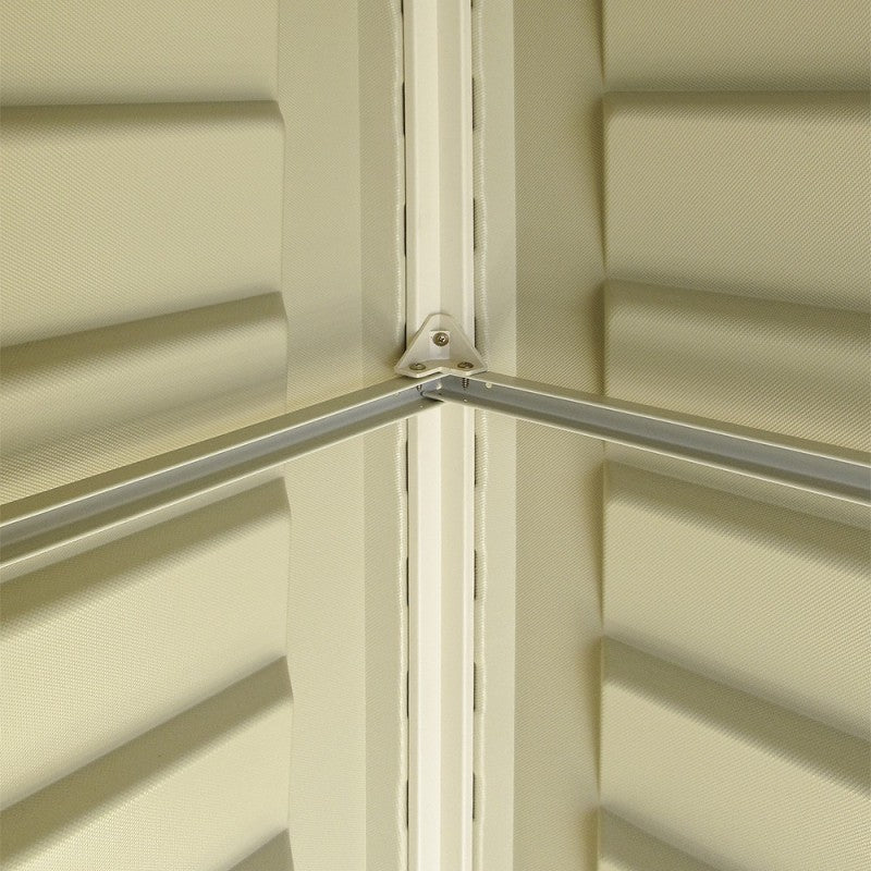 Die Seitenwandpfosten sind außerdem mit einem soliden Metallrahmen verstärkt, der den Schuppen nicht nur mehr Festigkeit verleiht, sondern auch die Montage von Regalen oder Haken für Gartengeräte ermöglicht. Wenn die Häuser richtig im Boden verankert sind, widerstehen sie Windgeschwindigkeiten von bis zu 180 km/h. Außerdem sind sie schneelastgeprüft: Sie halten bis zu 100 kg/m2 aus. Es handelt sich um Gerätehäuser von zertifizierter Qualität, wie die 15-jährige Garantie (die längste der Branche!) beweist.