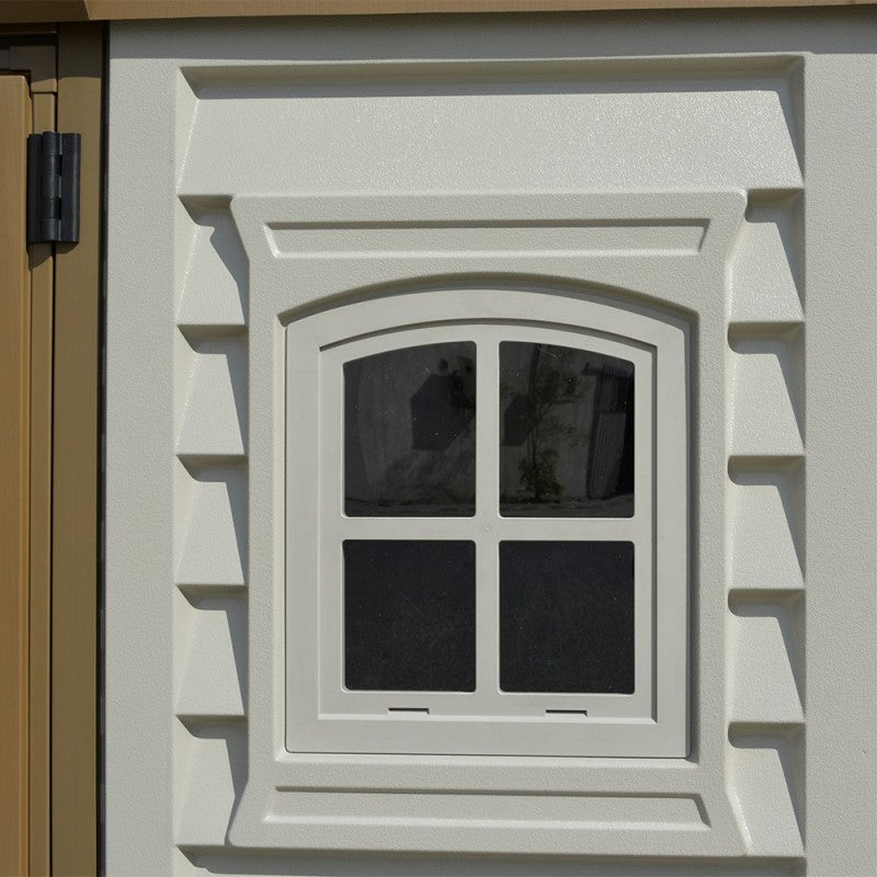 Das Spielhaus umfasst ein Belüftungssystem, einen Fundamentbausatz, große, breite braune Doppeltüren mit Griffschlössern und Vorhängeschlossösen, 2 Fensterwände an der Vorderseite und ein überlappendes braunes Schindeldach. Es ist ein wetterbeständiger, langlebiger, wartungsfreier Vinylschuppen, der nicht rostet, verrottet, verbeult oder schimmelt. Es ist feuerhemmend und einfach zu montieren.