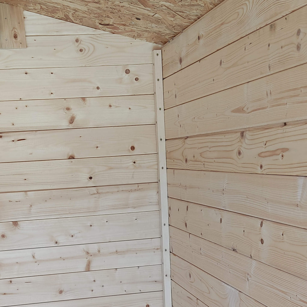 - Wände aus unbehandelter 16 mm starker natürlicher Fichtenholzplatte, verstärkt mit Holzbrettverankerung in den Ecken
