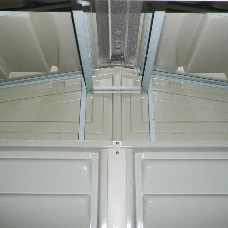 Der Schuppen wird von hochbelastbaren Innenträgern aus verzinktem Stahl getragen. Die Seitenwände sind außerdem mit einem soliden Metallrahmen verstärkt, der den Schuppen Festigkeit verleiht und die Montage von Regalen und das Aufhängen von Gartengeräten ermöglicht. Diese Gerätehäuser wurden getestet, um starken Winden (bis zu 180 km/h bei ordnungsgemäßer Verankerung im Boden) und einer Schneelast von bis zu 100 kg/m2 standzuhalten. Diese Qualitätsschuppen haben eine Garantie von 15 Jahren (die längste Garantie in der Branche!).
