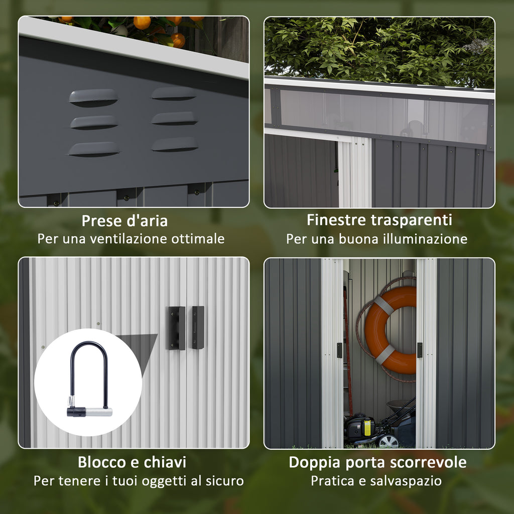 - VENTILAZIONE: Evita problemi di umidità e odori grazie alle 2 finestre incluse. Controllando l'umidità con un adeguato flusso d'aria, è inoltre possibile conservare tutti i tuoi attrezzi e utensili in questa casetta da giardino in metallo costruita per attenuare la muffa. Le 2 finestre in acrilico trasparente favoriscono un'efficiente trasmissione della luce per vedere meglio l'interno