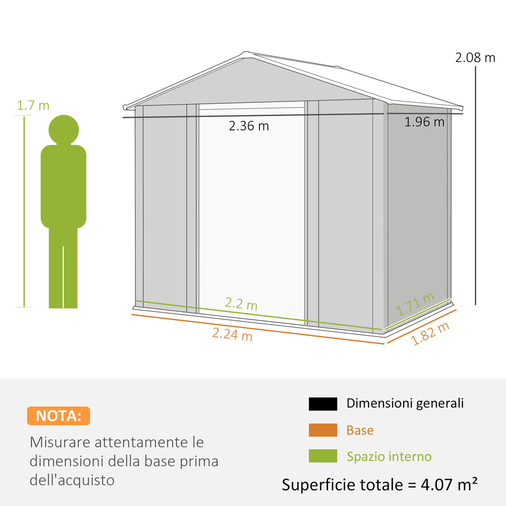- DIMENSIONI: Dimensioni generali: 236L x 196P x 208A cm. Superficie interna: 4.07m². Porta: 105L x 171A cm.
