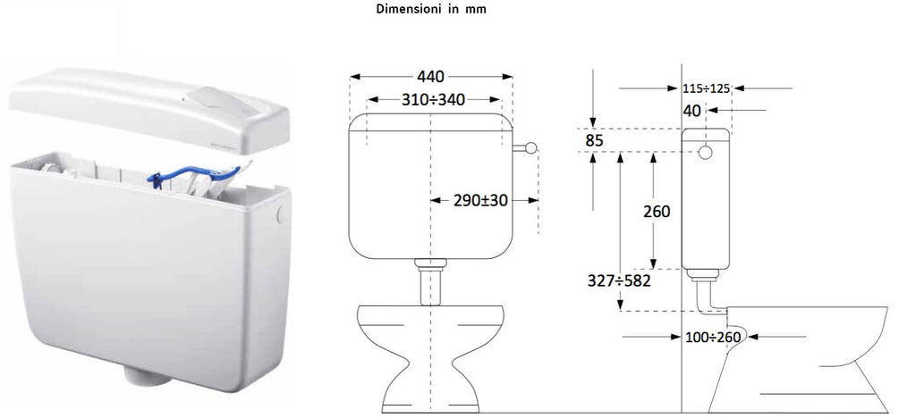 Externer WC-Spülkasten aus ABS mit Anti-Aging-Behandlung, ausgestattet mit zwei Spültasten , eine für eine vollständige Spülung und eine für eine Teilspülung des Wassers, diese Funktion bietet eine moderne Nutzung der Spülung, die für die Minimierung von Wasserverschwendung ohne Einbußen unerlässlich ist maximale Effizienz.