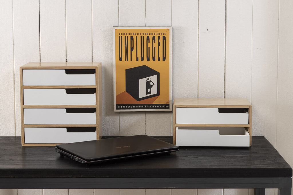 Schreibtischkommode oder interne Möbelstruktur aus naturfarben lackiertem Paulownia-Holz und 2 Schubladen aus weiß lackiertem MDF mit Griff links und rechts.