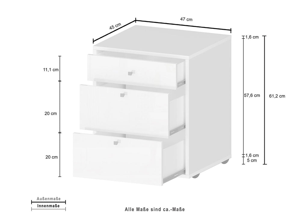 Cassettiera 3 Cassetti 47x45x61,2 cm Selina Bianco Lucido