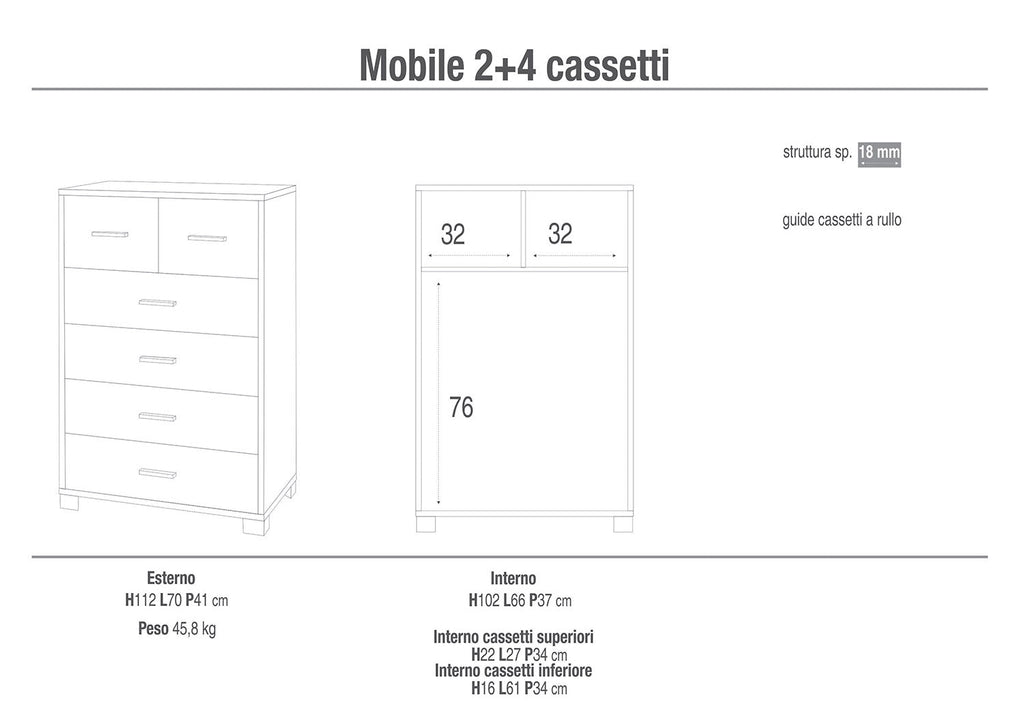 Cassettiera 4+2 Cassetti 70x112x41 cm Noce Stelvio/Bianco Fiammato