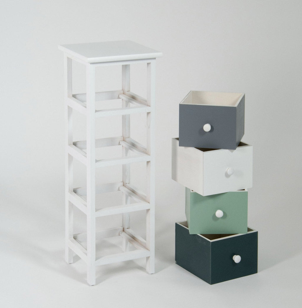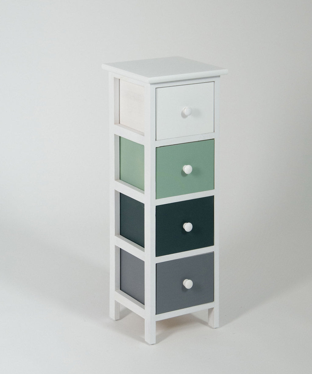 Kommode aus massivem Paulownia-Holz, handgefertigt. Ausgestattet mit 4 farbigen Holzschubladen.
