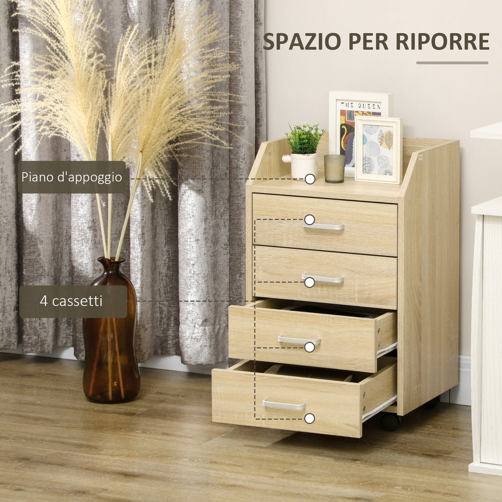 Cassettiera da Ufficio con 4 Cassetti Ruote e Bordi Rialzati 40x36x65 cm in Legno Legno Naturale