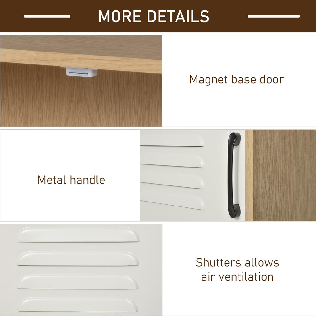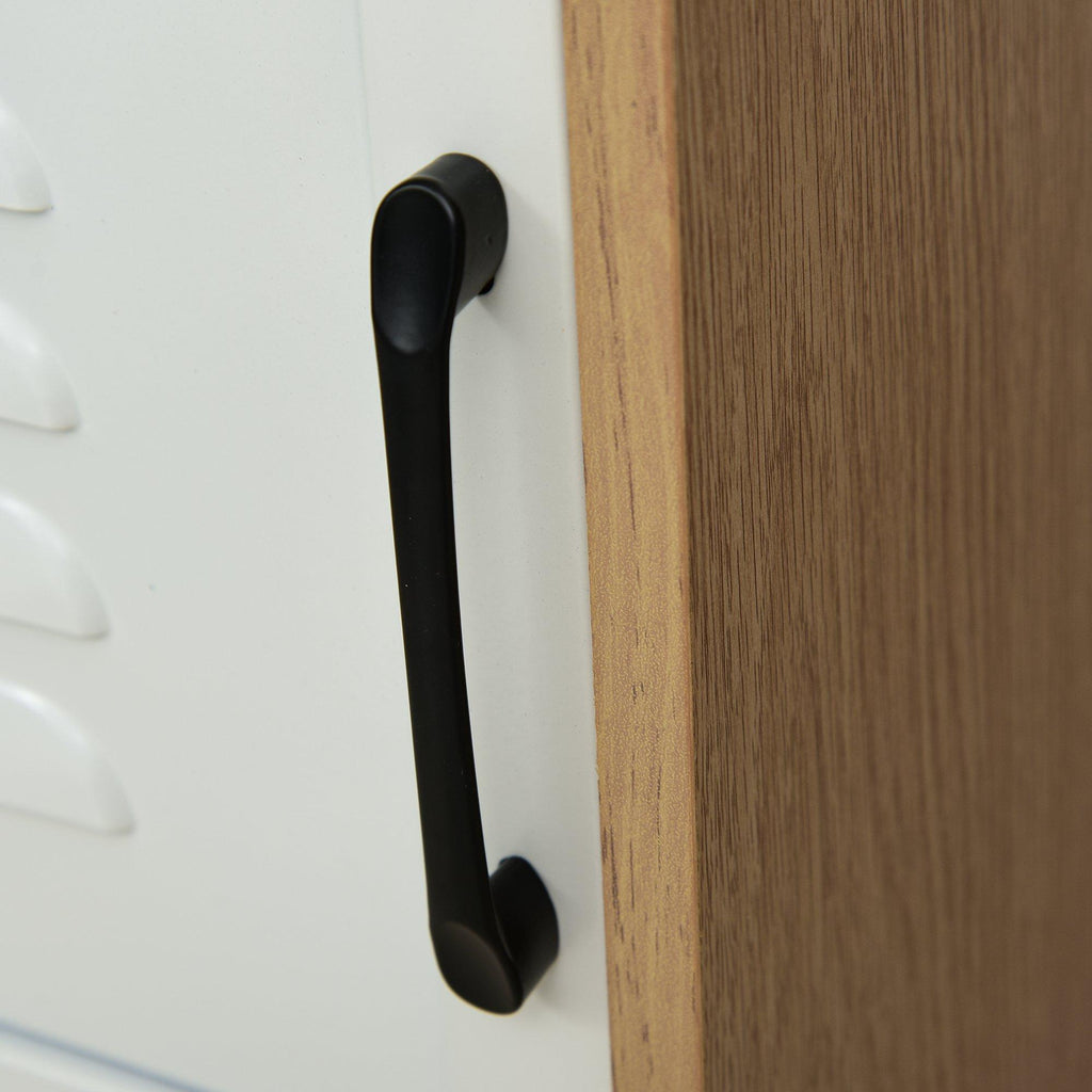 - METALLTÜREN: Die beiden Türen sind aus Metall mit weißer Oberfläche. Sie haben drei Schlitze in der Mitte, um die Luftzirkulation zu erleichtern, und einen schwarzen Metallgriff.