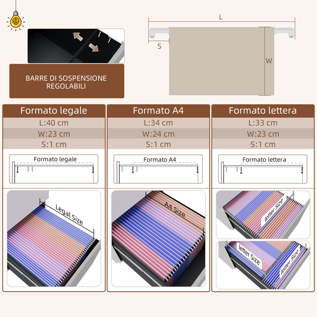 - Barra regolabile per contenere fascicoli in formato lettera, A4 e legale