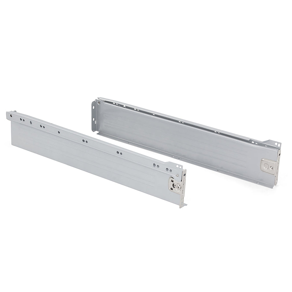 Das Küchen- und Badschubladen-Kit Ultrabox besteht aus Seitenprofilen aus Stahl mit Rollenführungen, die mit lackierten Aluminiumoberflächen gestaltet sind. Es ist das beste Preis-Leistungs-Verhältnis für Küchen- und Badezimmerschubladen. Jeder Bausatz enthält das gesamte Zubehör für die Montage einer Schublade: Seitenprofile, Führungssatz mit Fallrohr und Fronthaken für die Frontblende . Es erfordert zugeschnittene Paneele für den Boden und die Rückseite sowie die Schubladenfront. Die Befestigungshaken der Frontplatte erlauben eine exzentrische Justierung von ± 2 mm vertikal. Diese Haken sind bereits seitlich an der Stahlseite montiert.