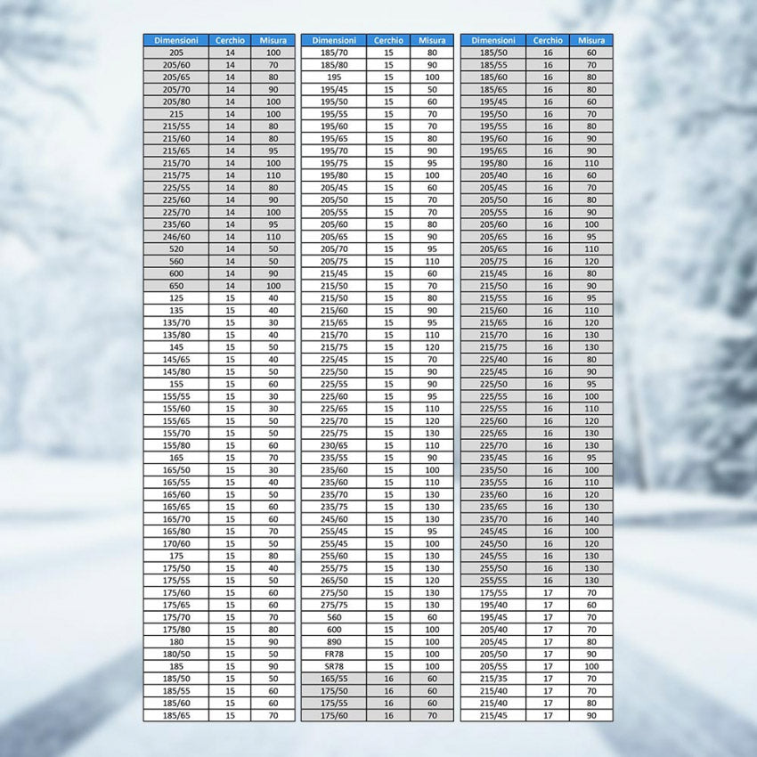 - Verfügbare Größen 20 - 30 - 40 - 50 - 60 - 70 - 80 - 90 - 95 - 100 - 110 - 120 - 130 - 140 (Siehe Größentabellen, um die am besten geeigneten für Ihre Räder auszuwählen)