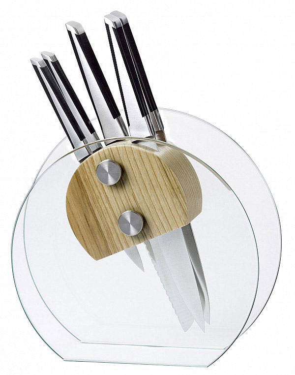 Der Alexander Crystal Design Messerblock ist ein professioneller Messerblock, der von Köchen und Liebhabern der raffinierten Küche ausgewählt wird : ein Treffen von Design und Zweckmäßigkeit, der Tradition von massiver Eiche und der Modernität von gehärtetem Glas .