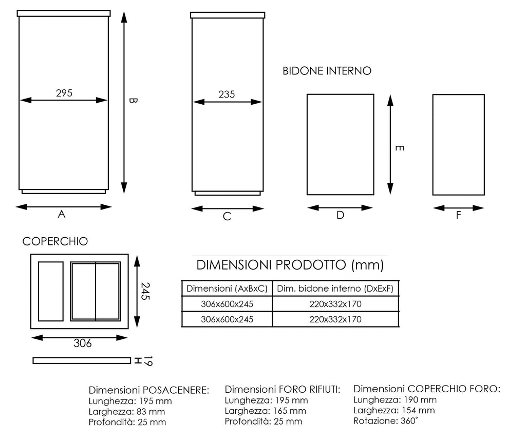 Papierkorb mit rechteckigem Aschenbecher aus Stahl, ausgestattet mit rostfreiem Fuß. Der herausnehmbare Inneneimer erleichtert das Entleeren des Mülls und ist mit einem Tragegriff ausgestattet.