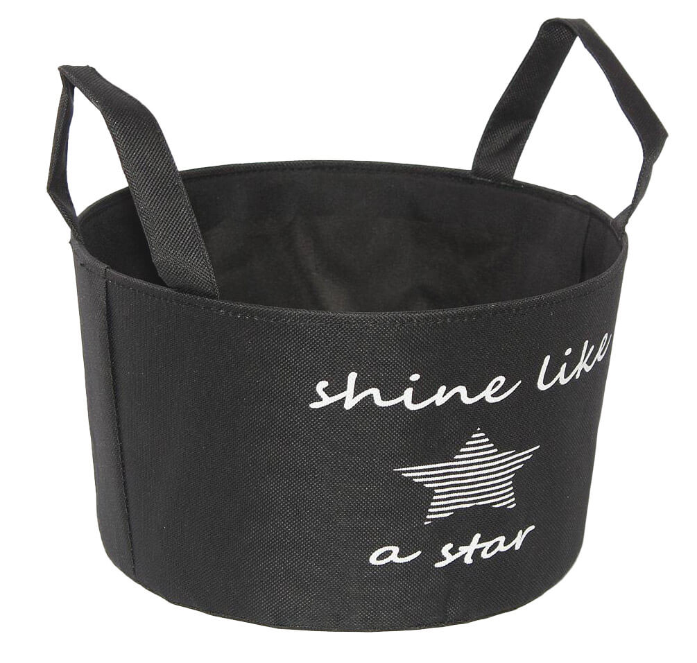Cesto contenitore in tessuto nero con manici. Adatto per il riponimento di piccoli oggetti come mollette, salviette, oggetti per il bagno.