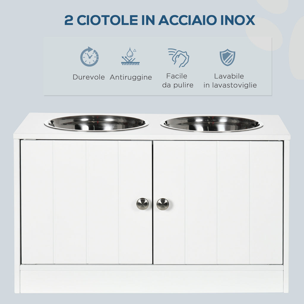Ciotole per Cani Rialzate con Armadietto da 44L e 2 Ciotole in Acciaio 60x30x35.5cm Bianco